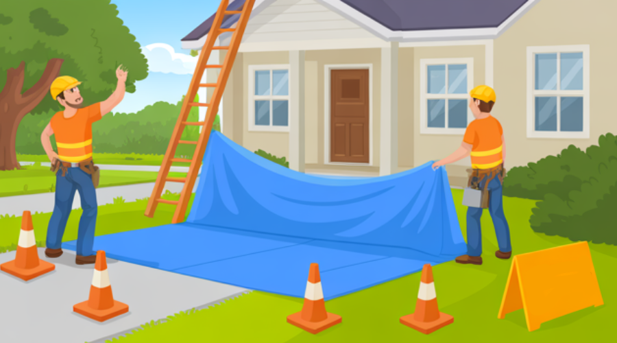 - Safety barriers and tarps are placed to protect landscaping, driveways, decks, and windows.